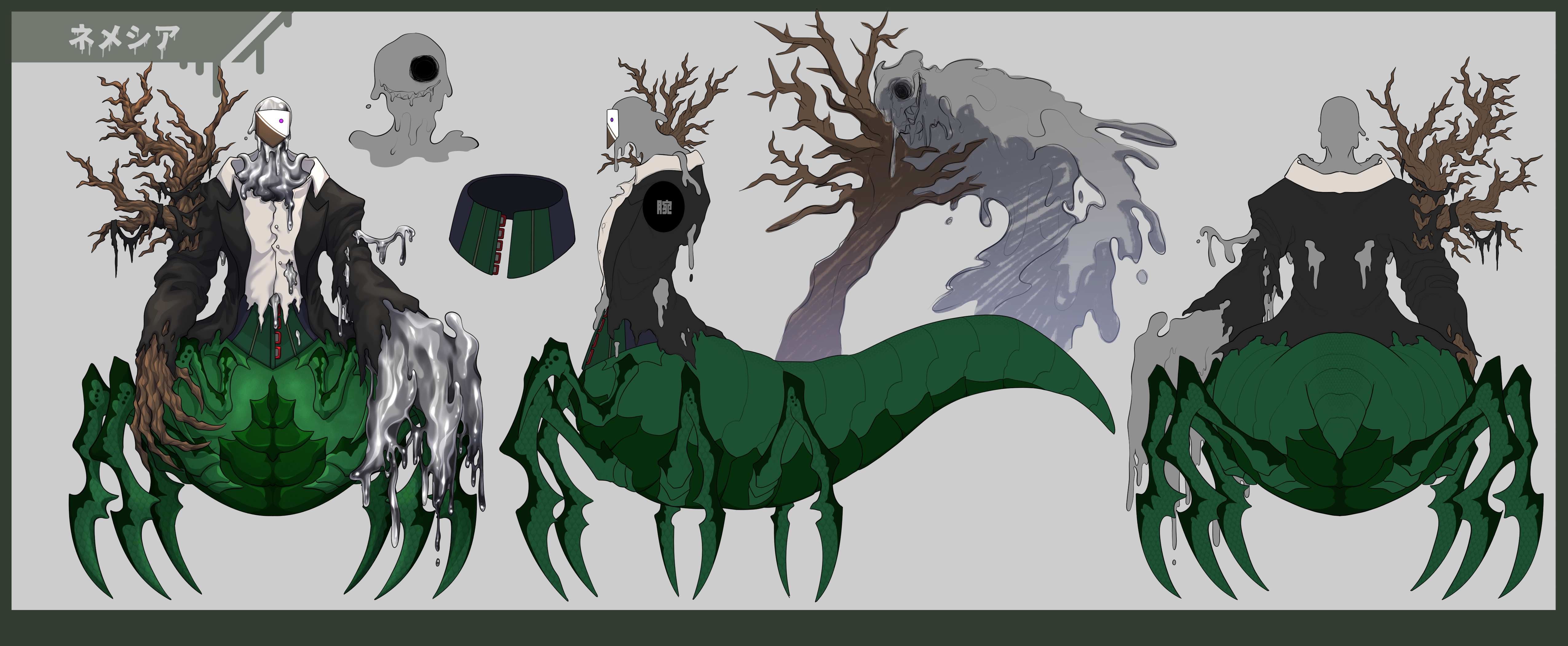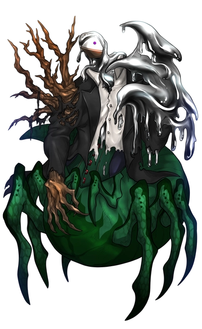 上半身は右肩から腕にかけては樹木、残りは流体金属であり