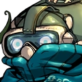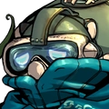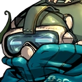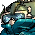 ダイバーヘルメットを被った学生風の青年。