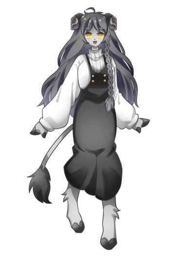 基本的に黒山羊の獣人姿でいて、腰まである長髪で右サイドに編み込みがされている。