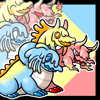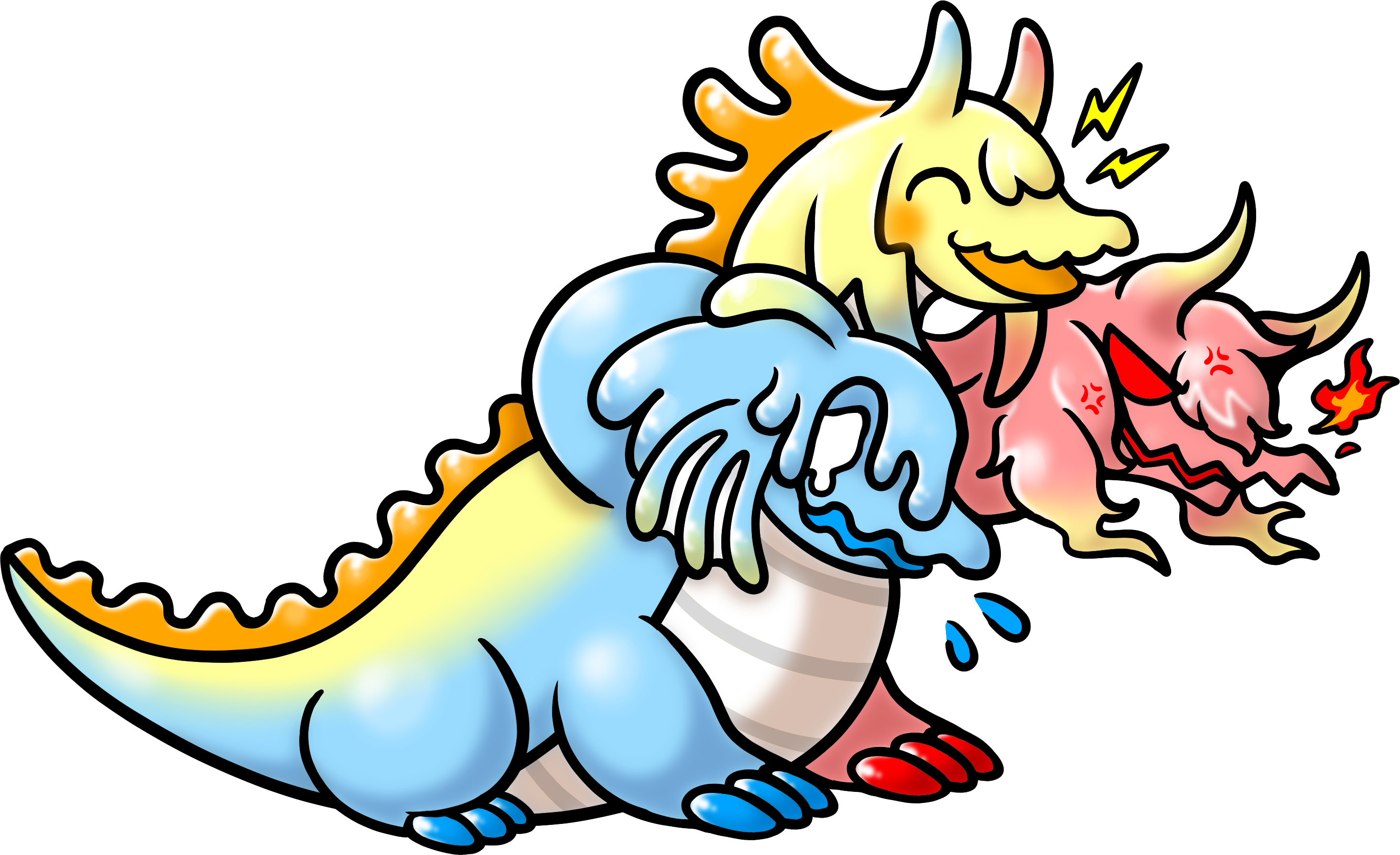 首によって保有属性が異なり、赤が火、青が水、黄色が光となっている。