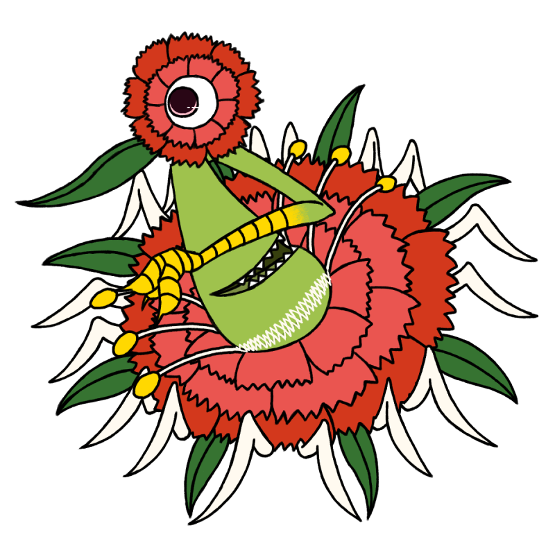 頭の花に大きな一つ目、同じ種類の大きな花の下半身、そして、鳥の脚のような三本指の左腕を持つ、半動半植物型の魔物。(※2)