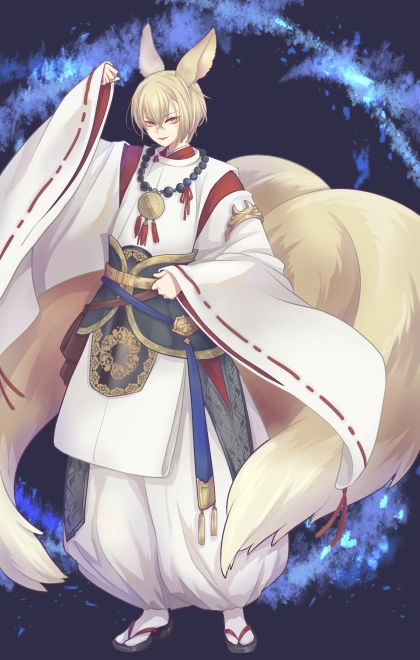 淡い金髪。黄金の眼は獣を思わせる縦の瞳孔。目尻に朱の目張り。